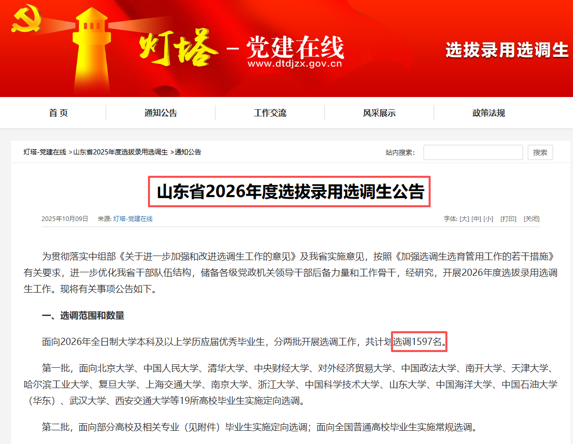 面向2026年全日制大学本科及以上学历应届优秀毕业生,分两批开展选调工作,共计划选调1597名。