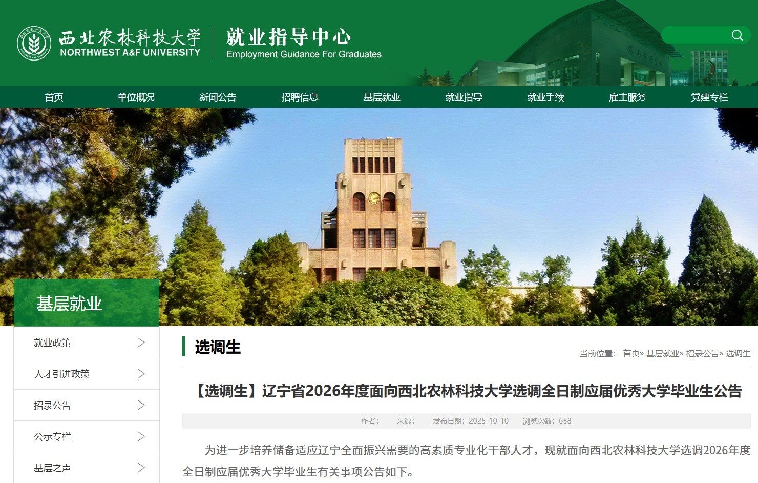 为进一步培养储备适应辽宁全面振兴需要的高素质专业化干部人才,现就面向西北农林科技大学选调2026年度全日制应届优秀大学毕业生有关事项公告如下。