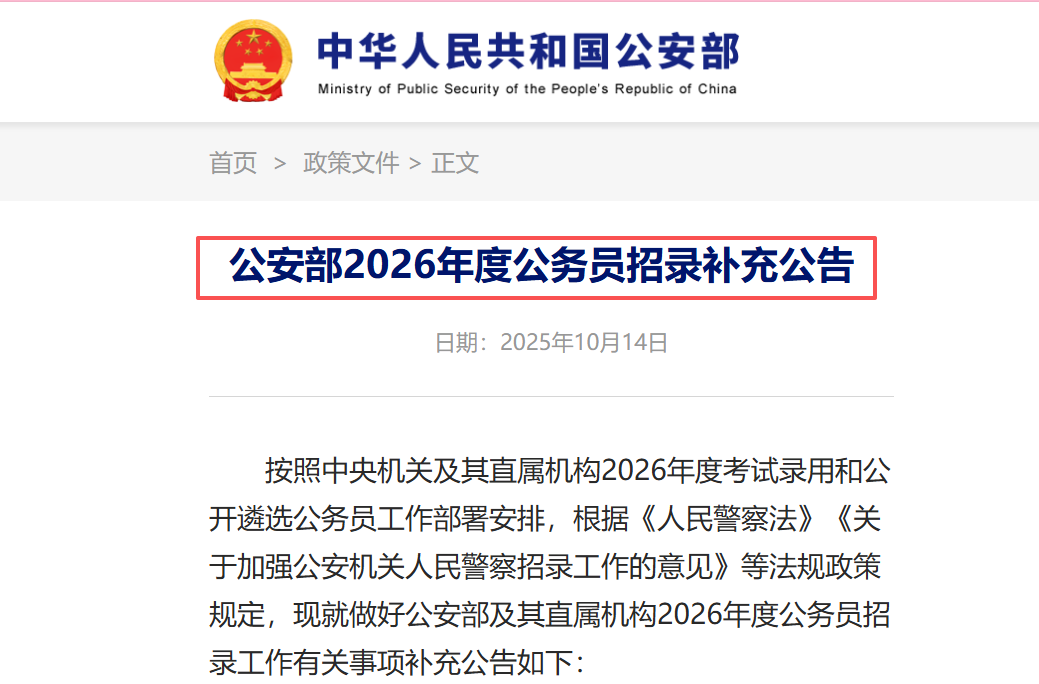 按照中央机关及其直属机构2026年度考试录用和公开遴选公务员工作部署安排,根据《人民警察法》《关于加强公安机关人民警察招录工作的意见》等法规政策规定,现就做好公安部及其直属机构2026年度公务员招录工作有关事项补充公告如下: