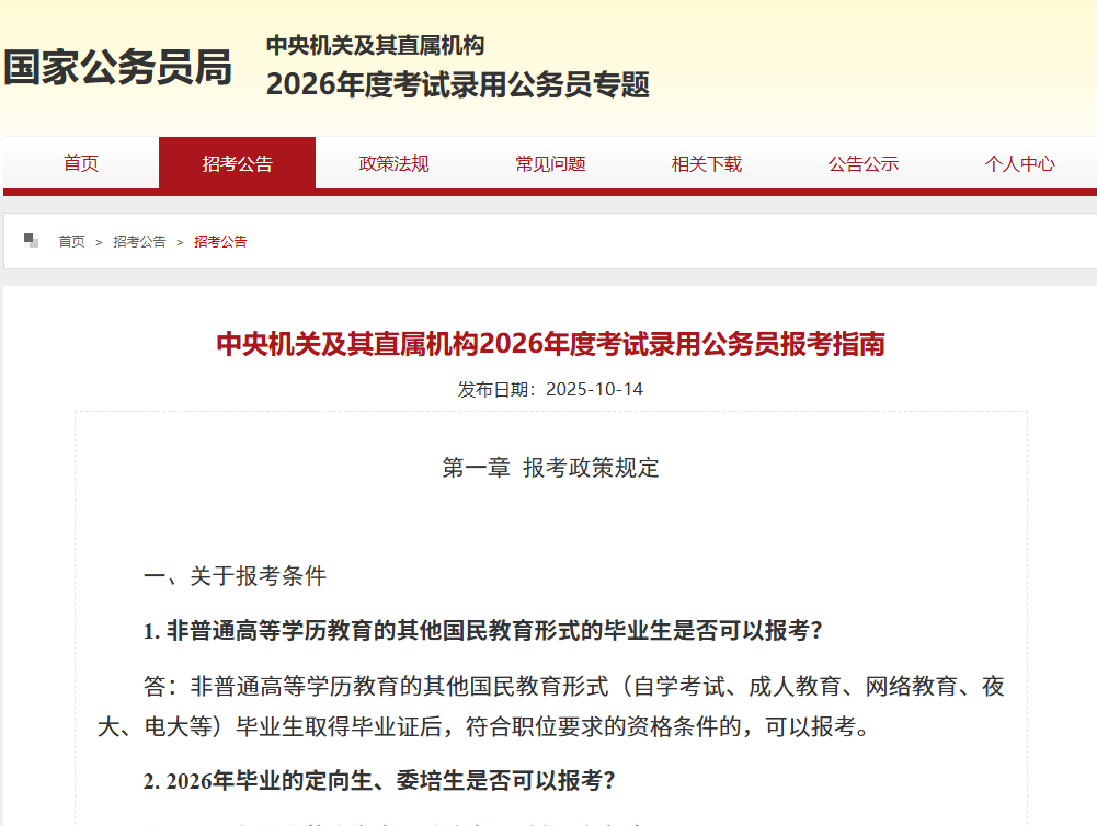 中央机关及其直属机构2026年度考试录用公务员报考指南