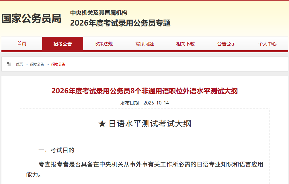 2026年度考试录用公务员8个非通用语职位外语水平测试大纲