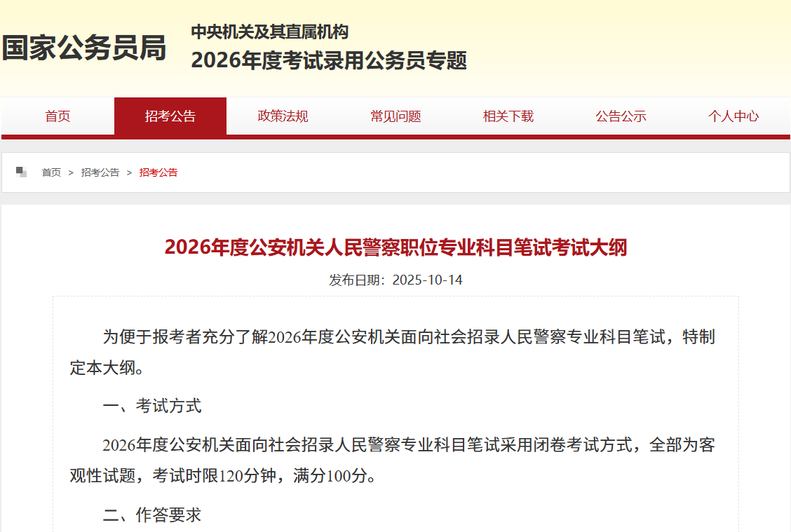 为便于报考者充分了解2026年度公安机关面向社会招录人民警察专业科目笔试,特制定本大纲。