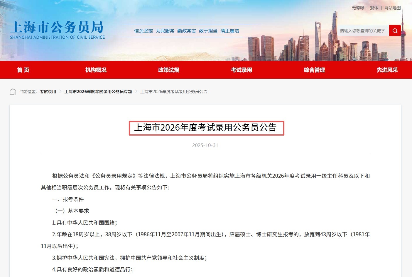 根据公务员法和《公务员录用规定》等法律法规,上海市公务员局将组织实施上海市各级机关2026年度考试录用一级主任科员及以下和其他相当职级层次公务员工作。现将有关事项公告如下: